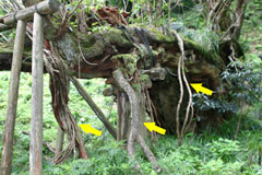この過程は小さな規模ですが今でも見ることができます。 北東方向に横たわった太枝から出た小枝が折れて地表に接し、この小枝が腐朽する過程で中を不定根が伸び、地面に根を下ろしているものがあります。(写真参照)